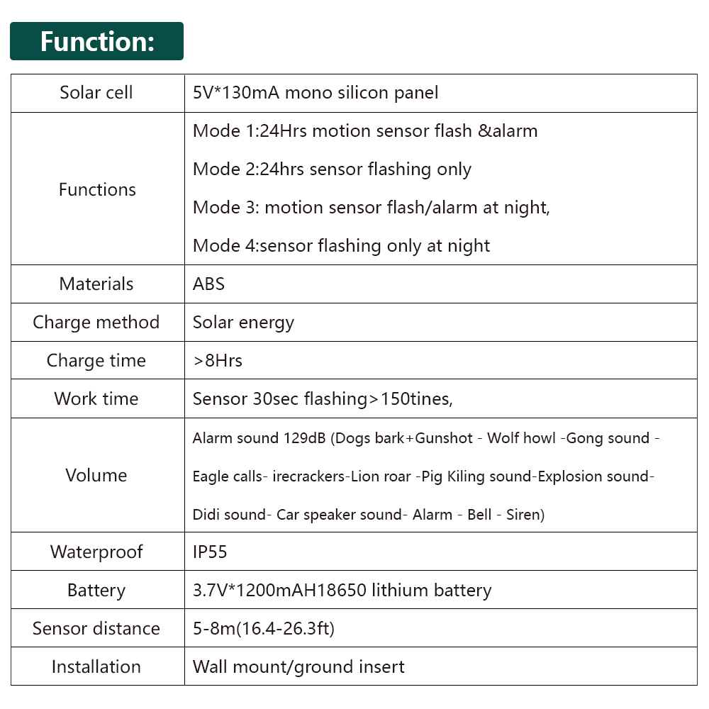 Mode 1# 24hrs motion sensor flash & alarm,Mode 2# 24hrs motion sensor flash