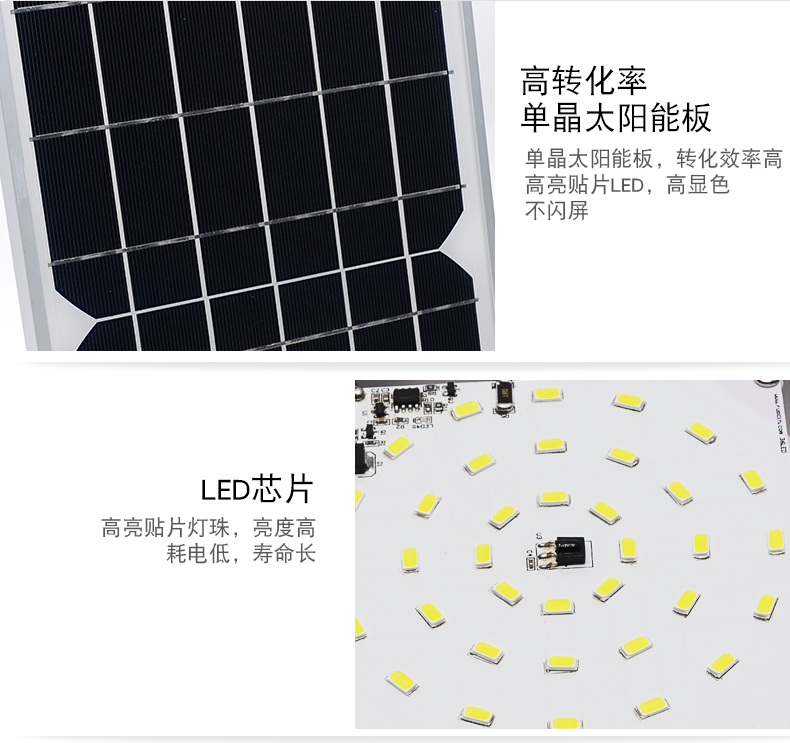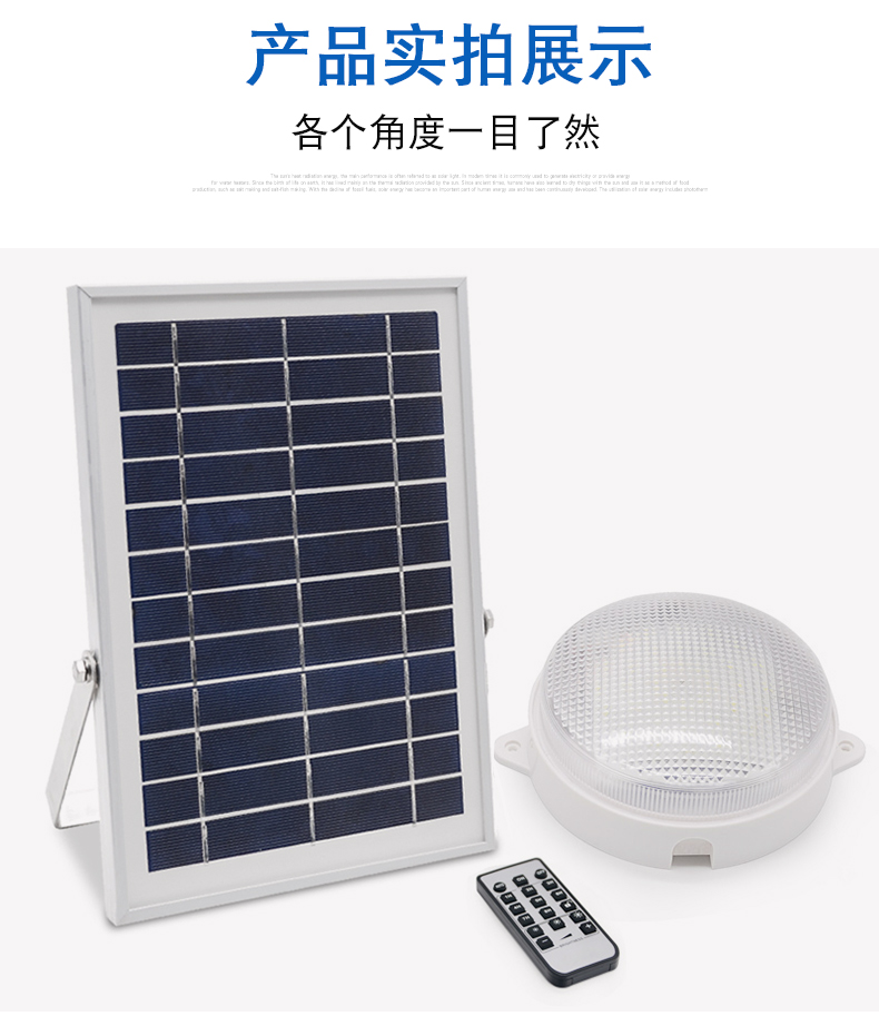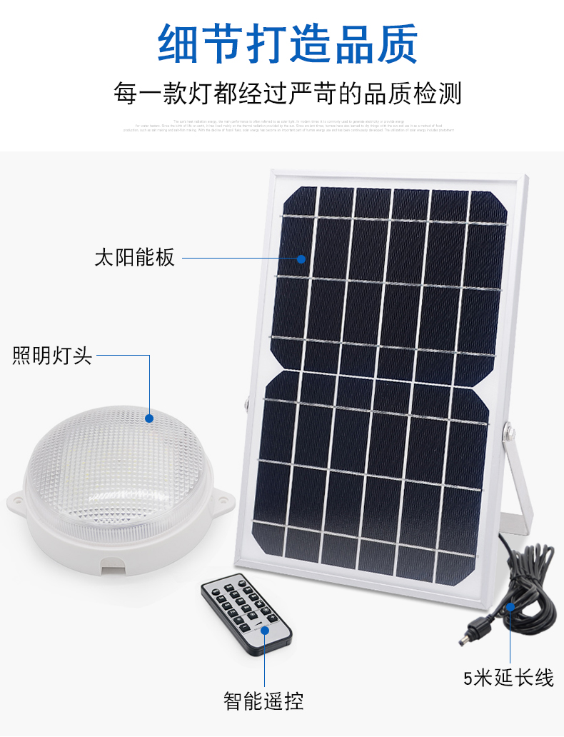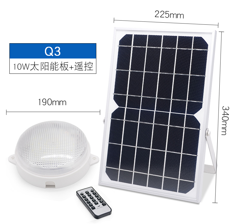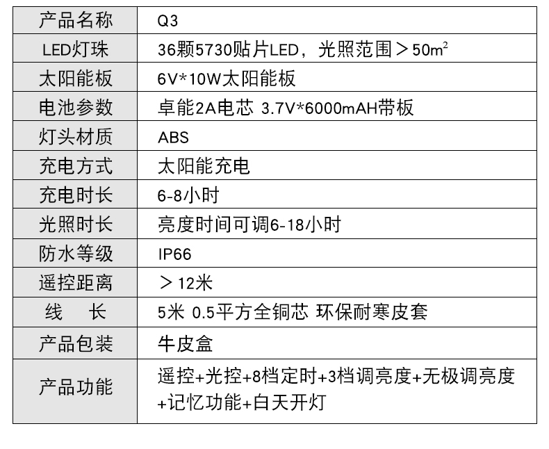 太阳能板:6V*10W单晶硅太阳能板LED:36颗5730贴片LED,光照范围>50m²电池:3.7V*6000mAH灯头材质:ABS充电方式:太阳能充电/DC充电充电时长:6-8小时(不同季节关照强度不同会影响充电效率)光照时长:亮灯时间可调4-12小时线长:5米 0.5平方全铜芯 环保耐寒皮套防水等级:IP66功能:遥控+光控+8档定时+3档调节亮度+无极调节亮度+记忆功能+白天开灯