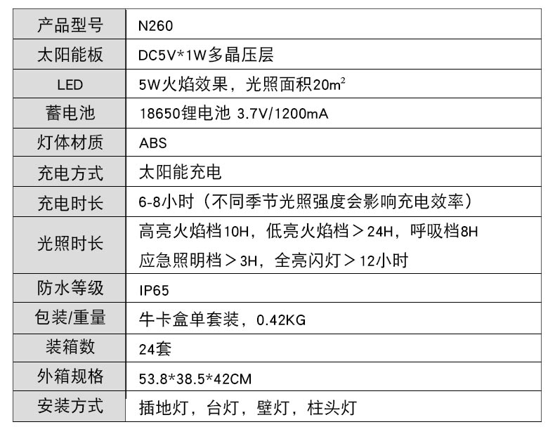 光照时长:高亮火焰档10H,低亮火焰档>24H,呼吸档8H