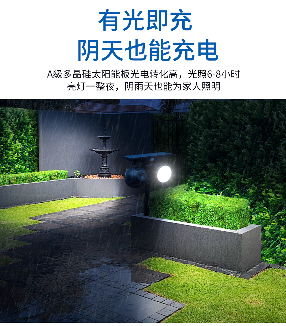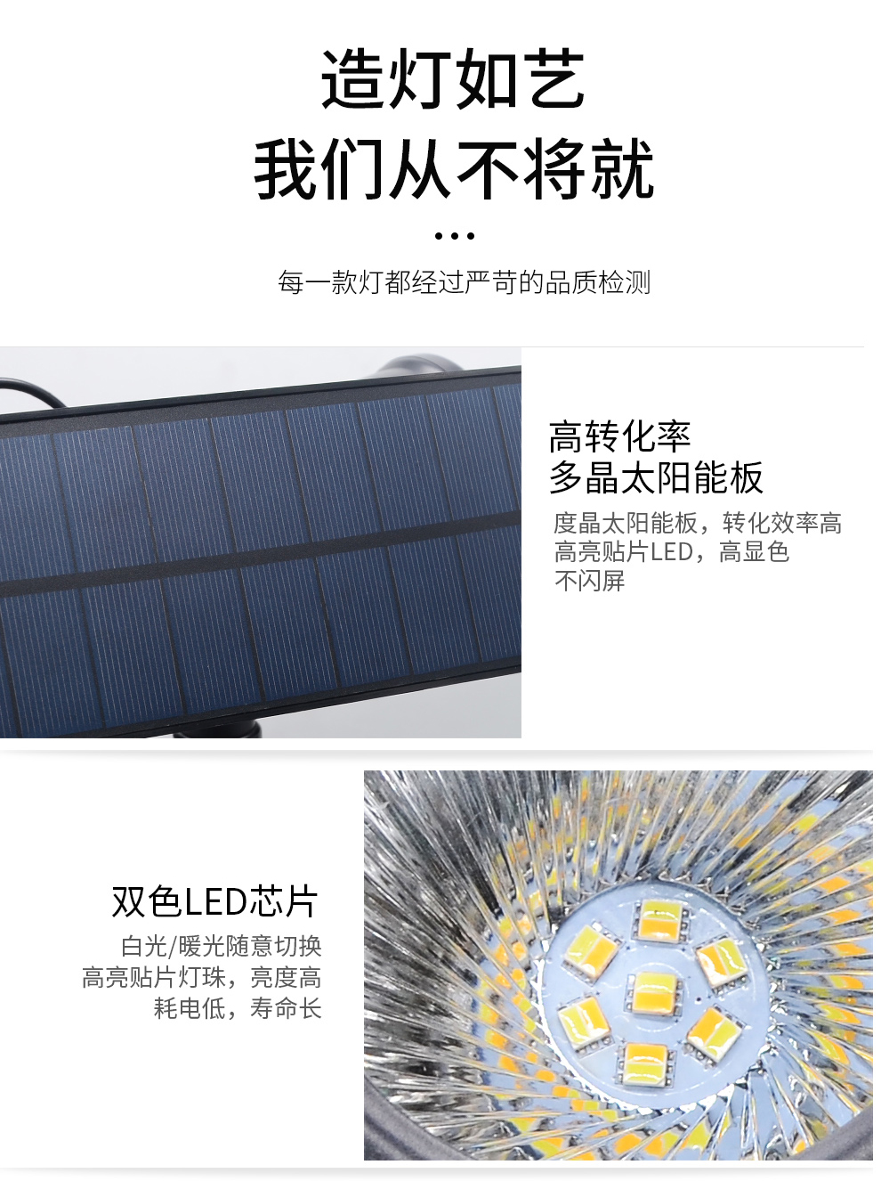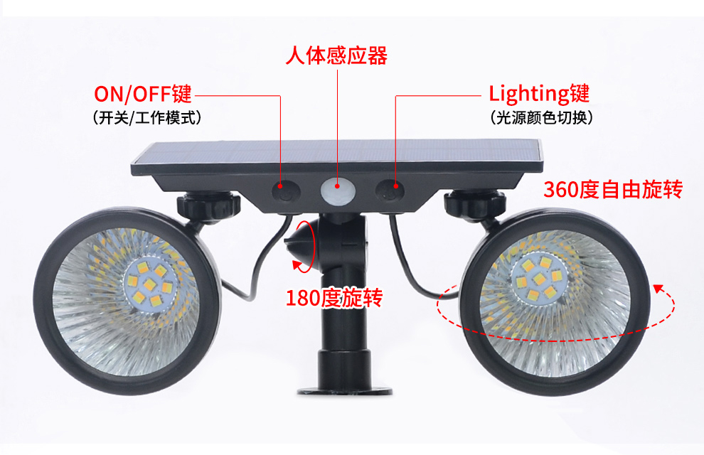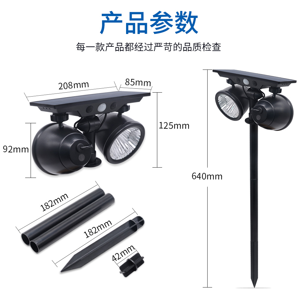 双灯头太阳能草坪灯高效多晶硅太阳能板充电,太阳能板可180°旋转,灯头可360°旋转太阳能板: DC6V*2W高效多晶压层太阳能板LED参数 : 14颗高亮暖/白双色LED,光照面积40-100平米角度方向可调工作时长: 1档感应强光>100次/弱光长亮12小时, 2档感应>150次 3档8小时, 4档>200次充电方式: 太阳能充电充电时长: 6-8小时(不同季