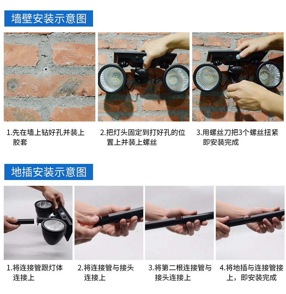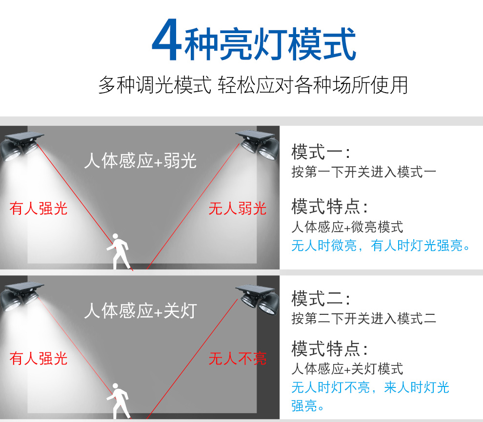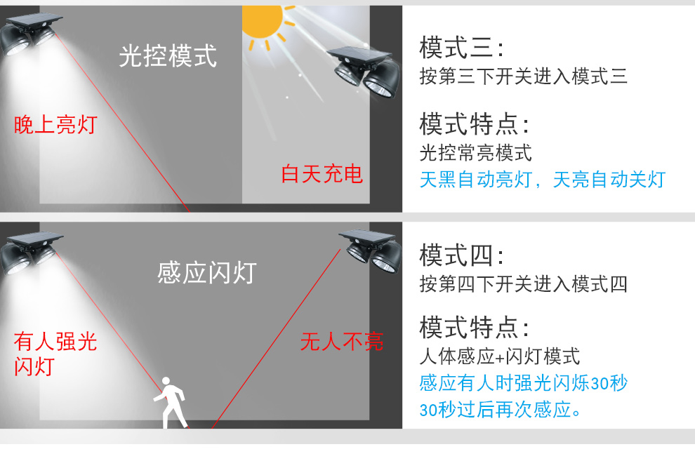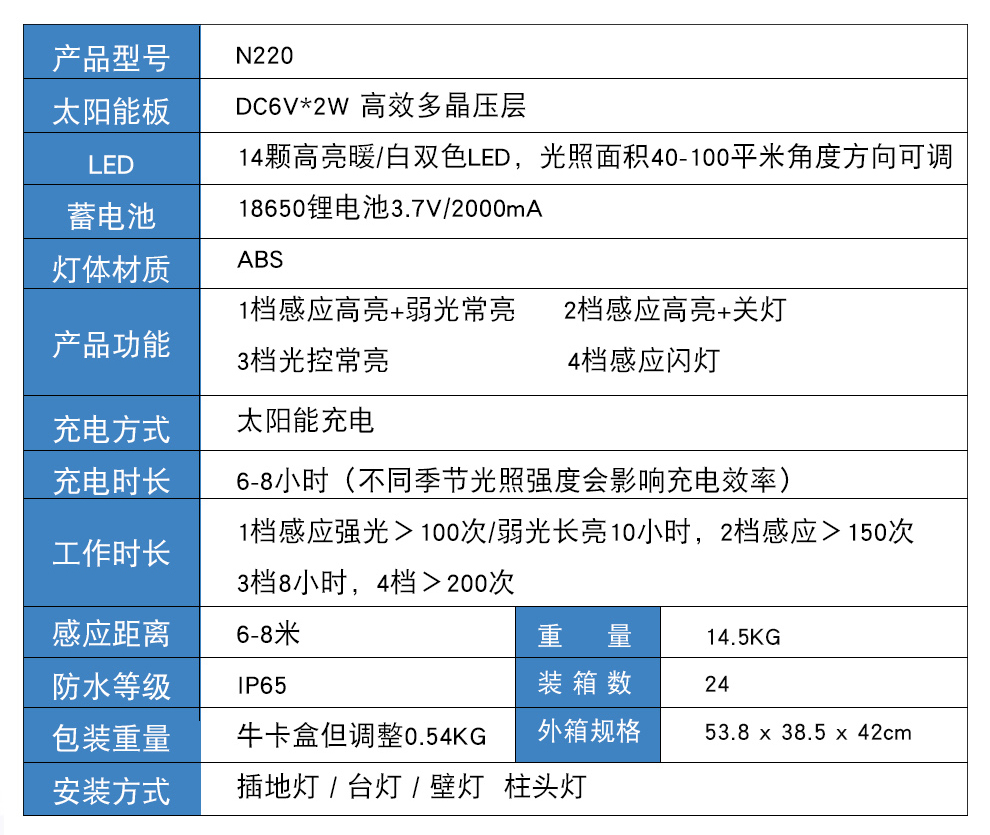 双灯头太阳能草坪灯高效多晶硅太阳能板充电,太阳能板可180°旋转,灯头可360°旋转太阳能板: DC6V*2W高效多晶压层太阳能板LED参数 : 14颗高亮暖/白双色LED,光照面积40-100平米角度方向可调工作时长: 1档感应强光>100次/弱光长亮12小时, 2档感应>150次 3档8小时, 4档>200次充电方式: 太阳能充电充电时长: 6-8小时(不同季