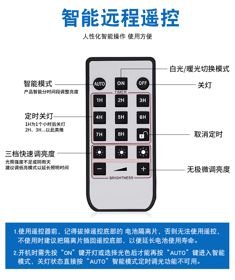 功能:遥控+光控+8档定时+3档调亮度+无极调亮度+记忆功能+智能模式+白暖双色