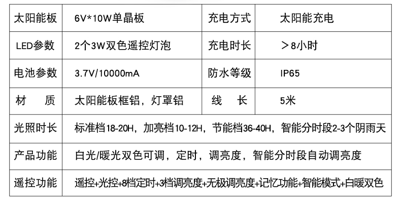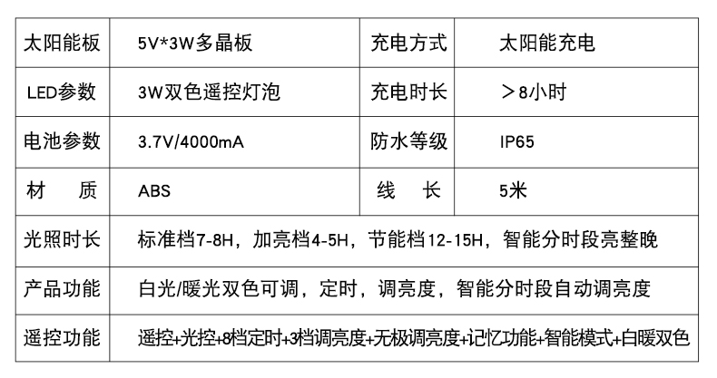 光照时长:标准档18-20小时,加亮档10-12小时,节能档36-40小时,智能分时段2-3个阴雨天