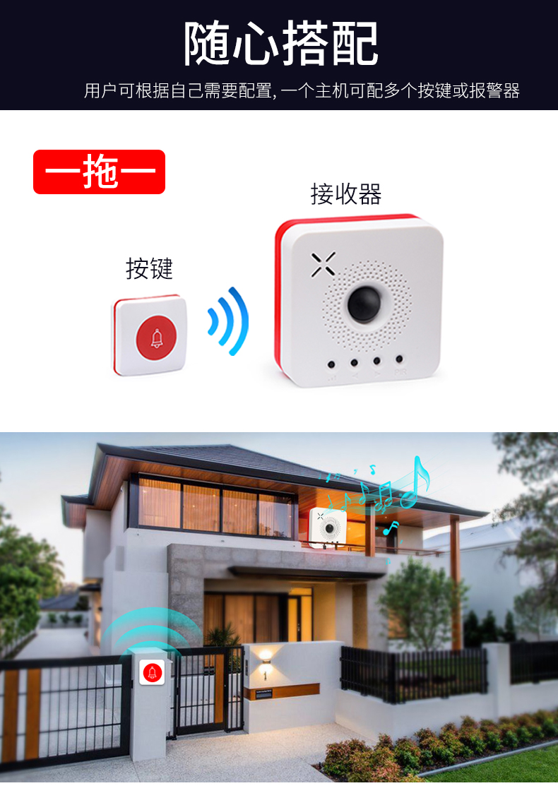 2.可一配多个无线按键满足门铃/求救/呼叫。