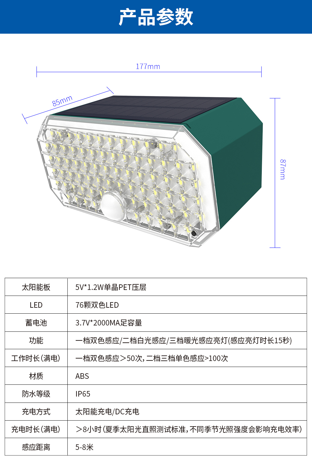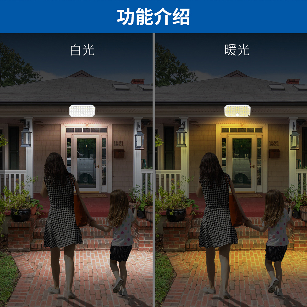 功能:一档双色感应/二档白光感应/三档暖光感应亮灯(感应时长15秒)