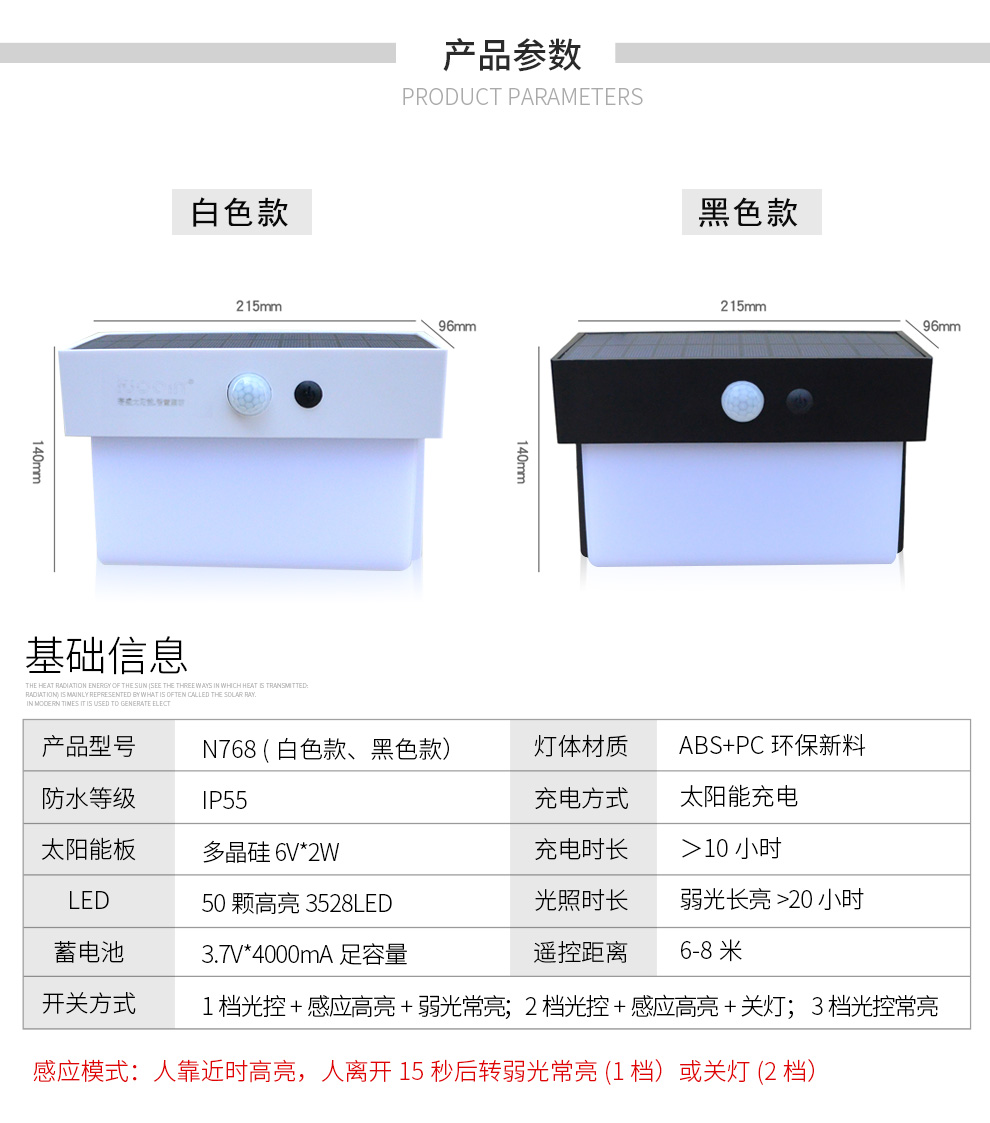 开关方式:1档光控+感应高亮+弱光常亮/2档光控+感应高亮+关灯/3档光控常亮