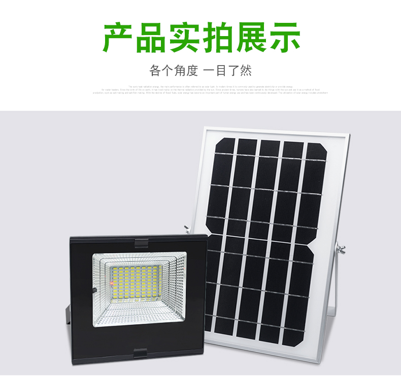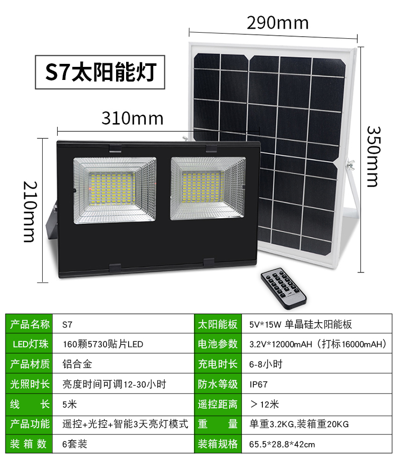 太阳能板:5V*25W单晶硅太阳能板LED:240颗5730贴片LED,光照范围>100m²电池:3.2V*24000mA材质:铝合金充电方式:太阳能充电充电时长:6-8小时光照时长:亮灯时间可调12-30小时线长:5米 0.5平方全铜芯 环保耐寒皮套防水等级:IP66功能:遥控+光控+8档定时+3档调节亮度+记忆功能+智能3天亮灯模式