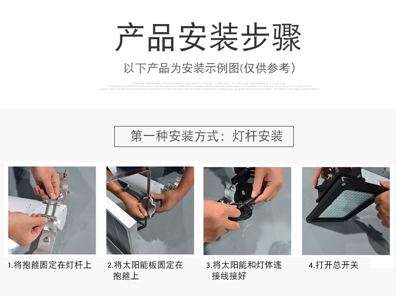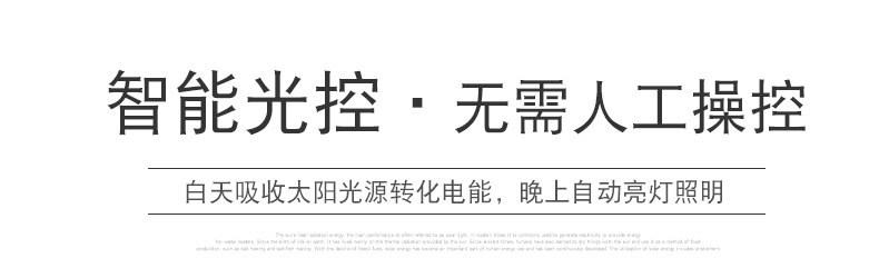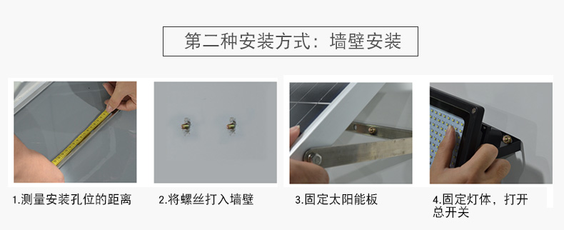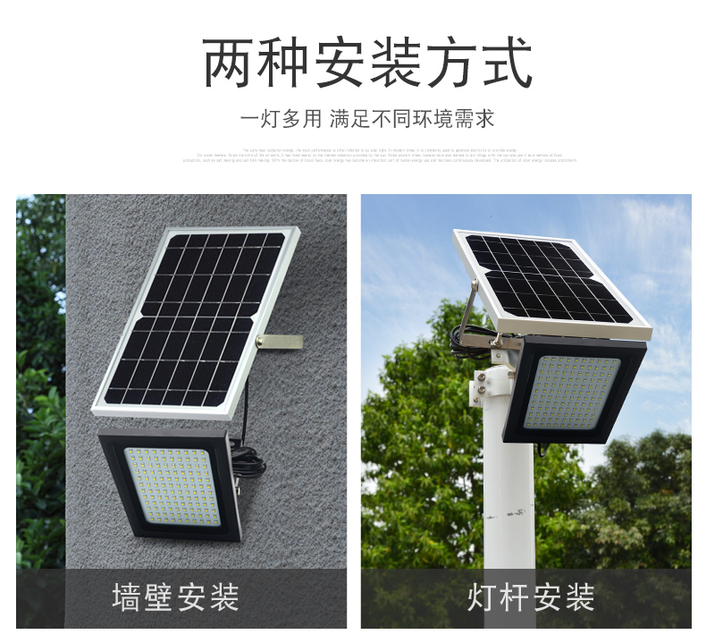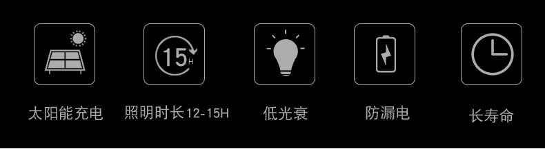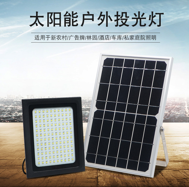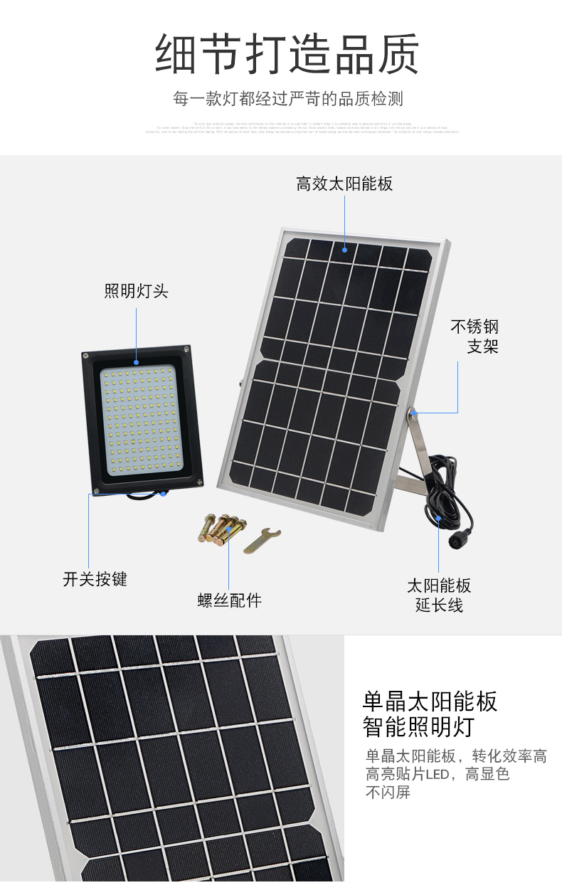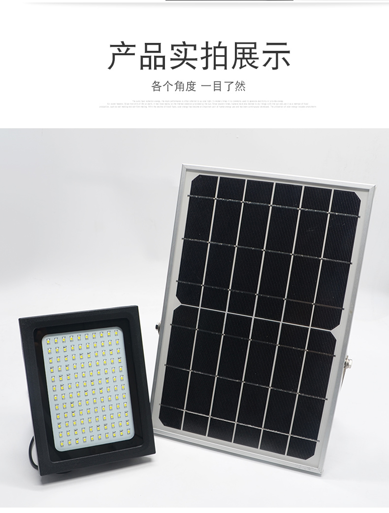 太阳能板:6V*10W单晶硅钢化玻璃压层板,配不锈钢支架LED:120颗2835贴片LED(600-800流明)金线铜支架开关方式;手控+光控光照范围:40-60平方米充电方式:太阳能充电充电时长:>8小时(不同季节的光照强度会影响充电效率)光照时长:12-15小时线长:5米防水延长线,0.2平方全铜芯,环保耐寒皮套防水等级:IP65包装:太阳能板/灯体单独牛卡盒包装电池:3.7V*10000mA足容量单套重量:2.2KG