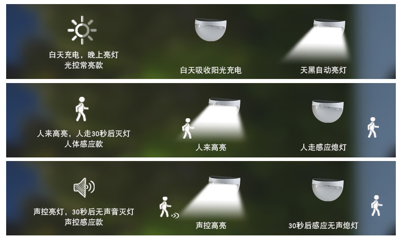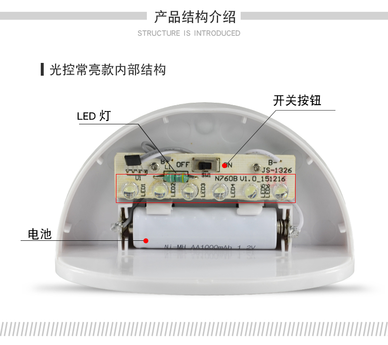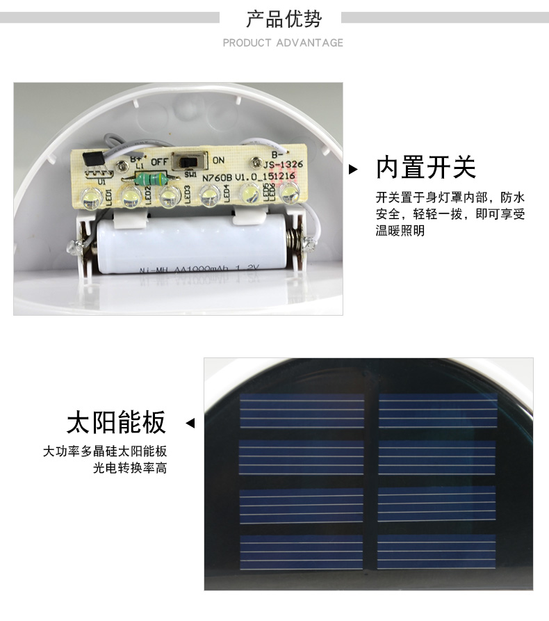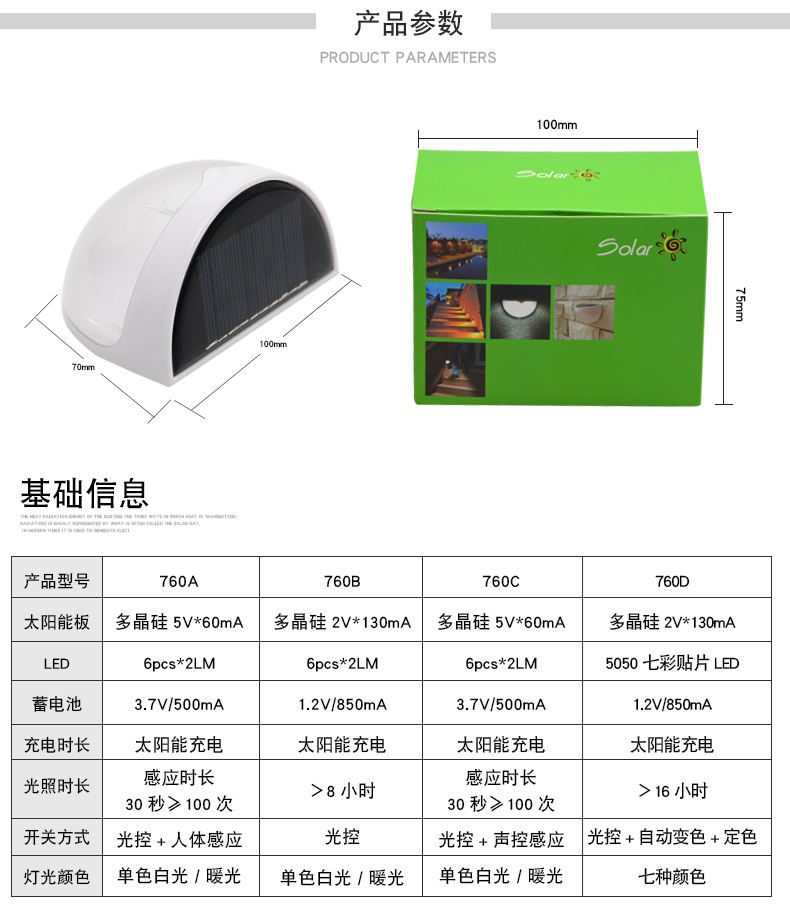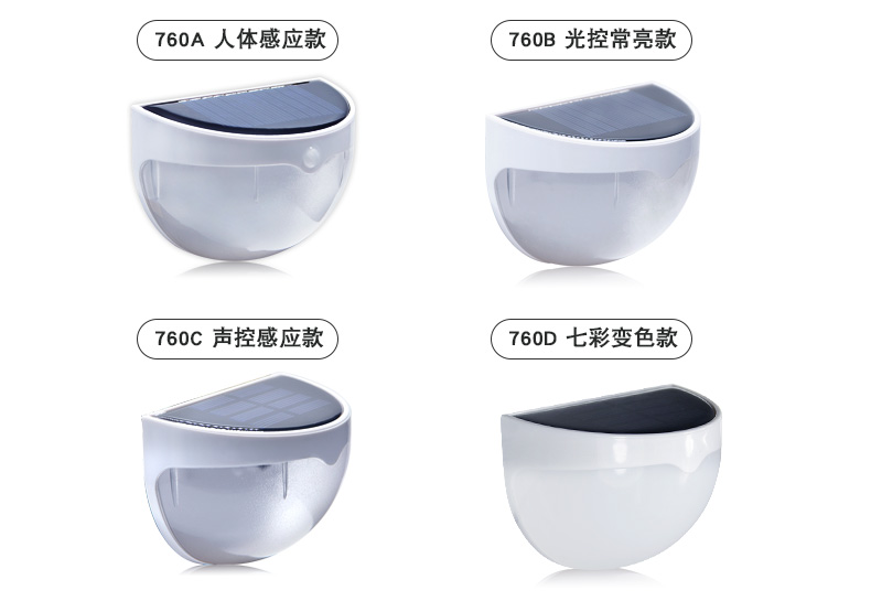 N760产品参数: 认证: CE,ROHS太阳能板: 多晶硅(B款2V*130mA)(A款C款5V*60mA)蓄电池: B款Ni-MH AA 1.2V/850mA(打标容量1000mA)A款C款锂电池3.7V/500mALED: B款6PCS*2LM,A款C款6PCS 3528*20LM开关方式: A款光控+人体感应, B款光控, C款光控+声控灯体材质: ABS+PC环保全新料防水等级: IP55充电方式: 太阳能充电充电时长:&nbs