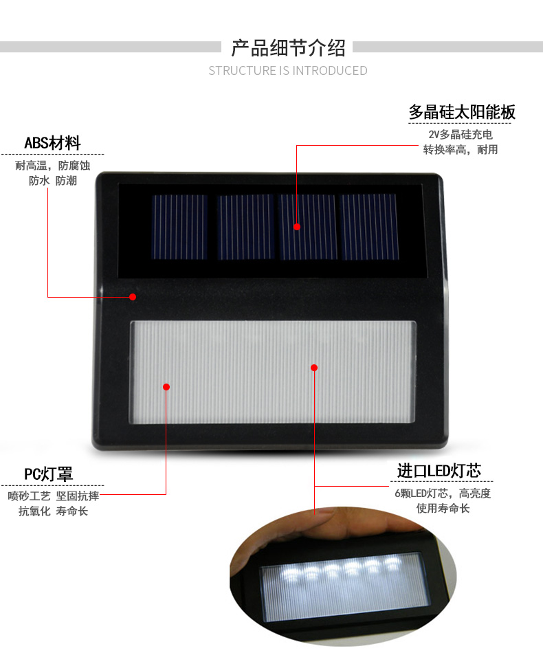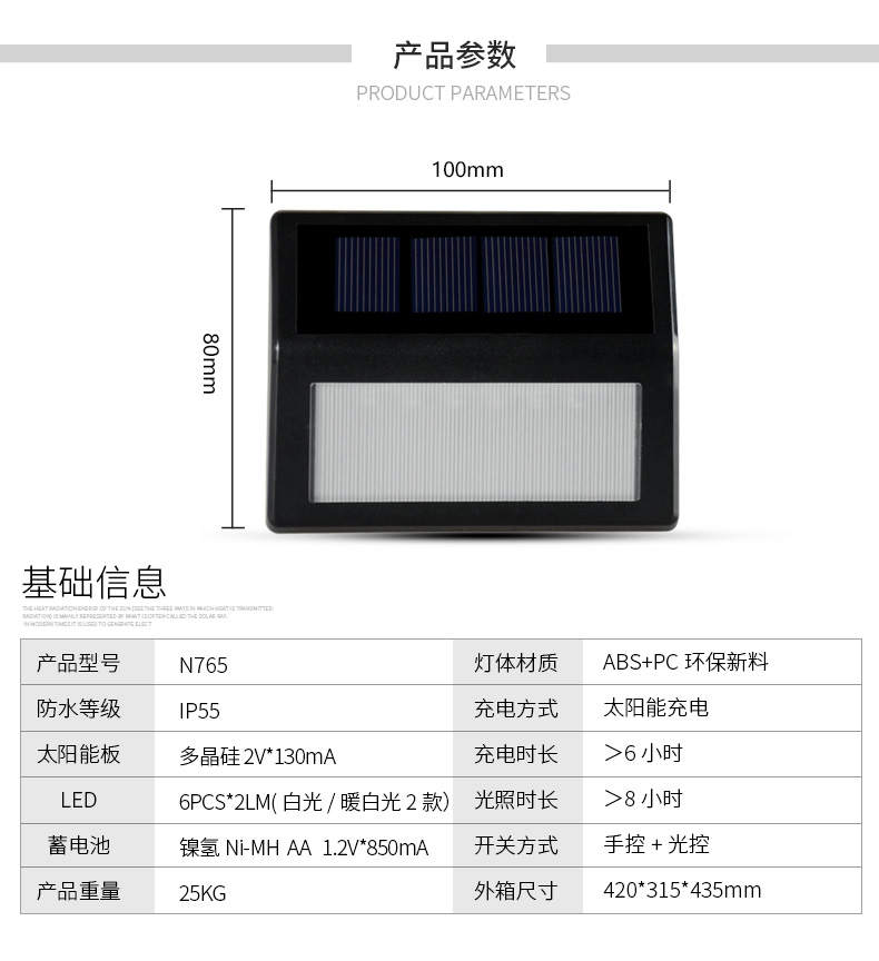 N765太阳能楼道灯,户外防水,无需布线,安装简单,免维护,天黑自动亮灯,独特的防拆孔设计,可应用于私家、别墅、酒店、旅馆、公园等场合围栏等,墙壁灯,楼道灯,花园篱笆灯之类户外灯光照明用途。