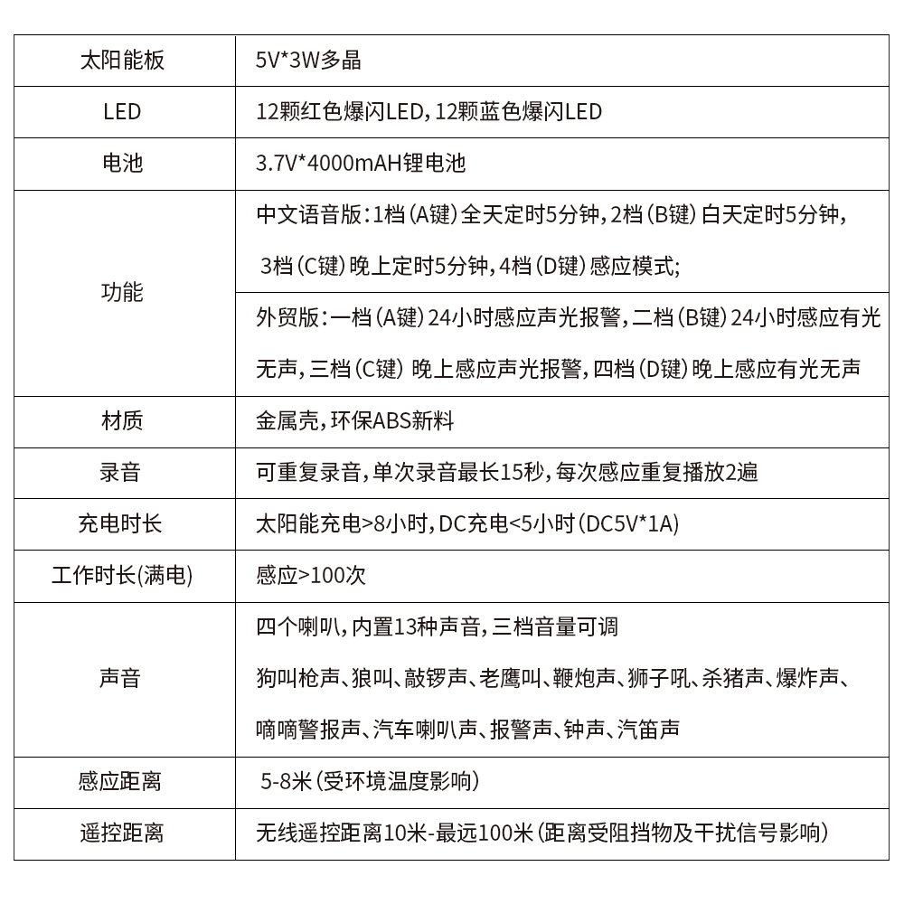 充电时长: 太阳能充电>8小时,DC充电<5小时(DC5V*1A)