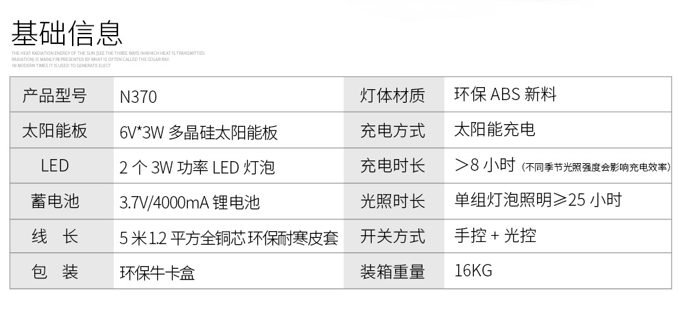 太阳能板:6V*3W压层板,钢化玻璃工艺,壁装/插地可换方式