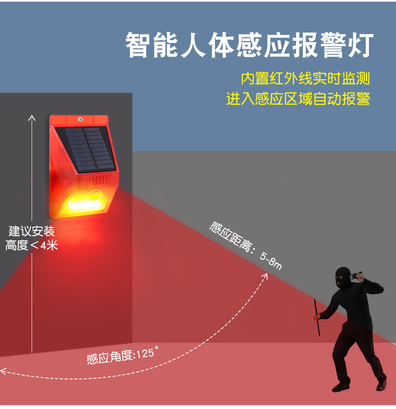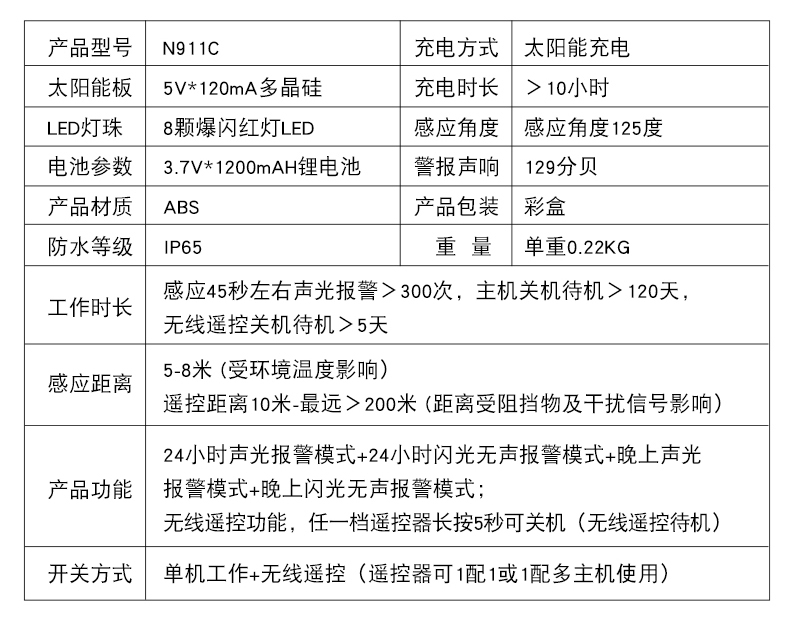 N911C太阳能户外远程遥控警报灯 太阳能板:5V*120ma多晶硅