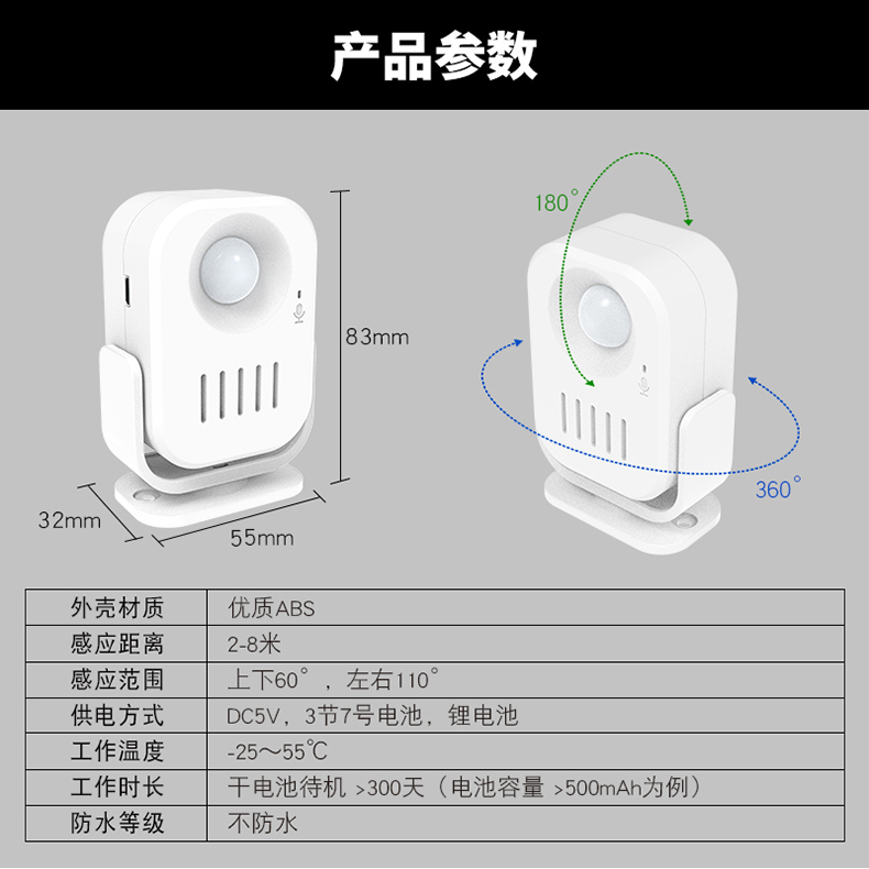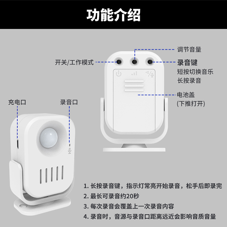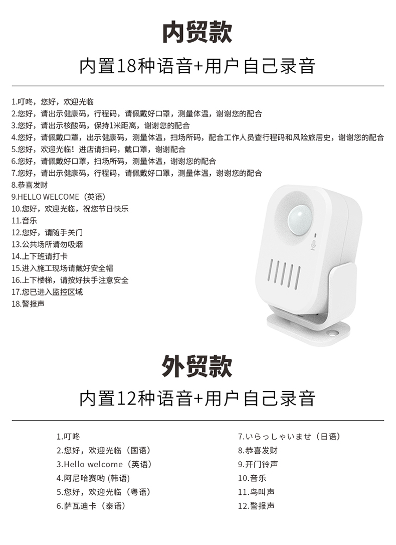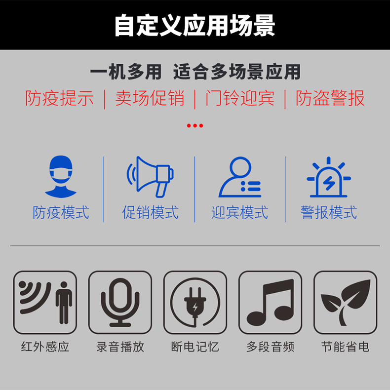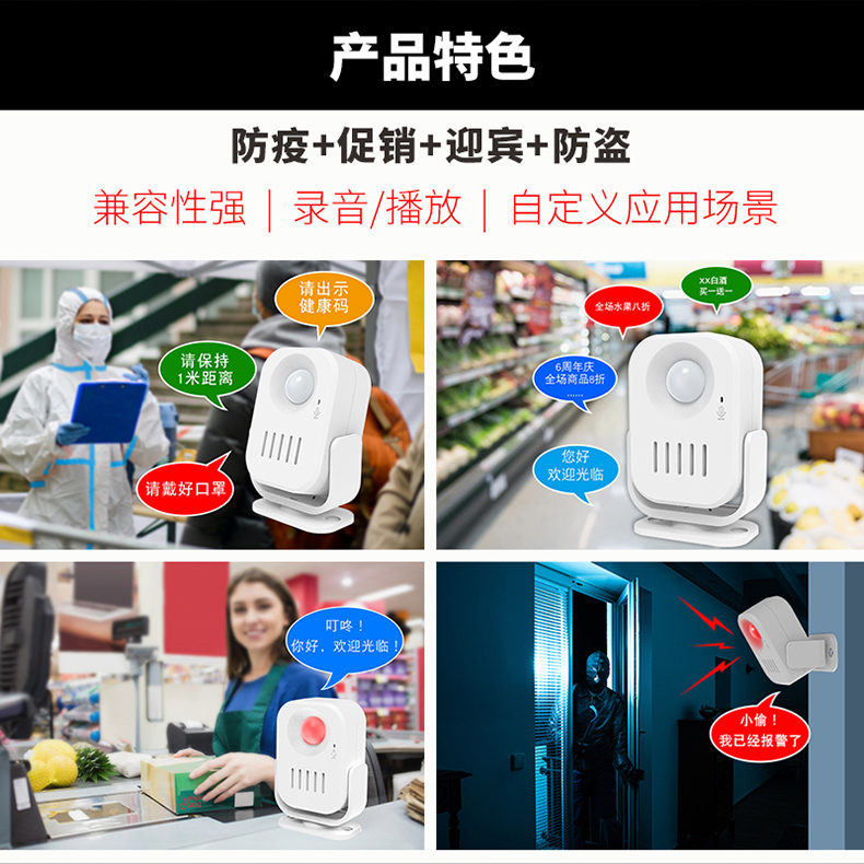 使用广泛:防疫提示、门铃迎宾、卖场促销、防盗警报等;