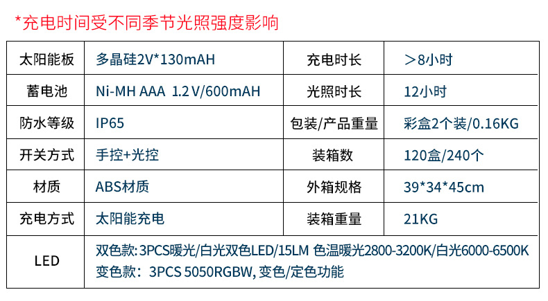 Polysilicon 1.2V130mA solar panel, 1.2V/600mAM battery, solar charging, automatic charging during the day, automatic light at night, dual-color white + warm light switch at will; Color changing 5050RGBW, color changing/fixed function