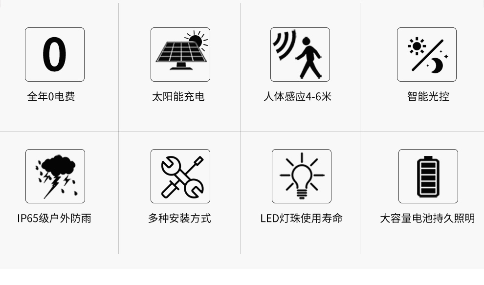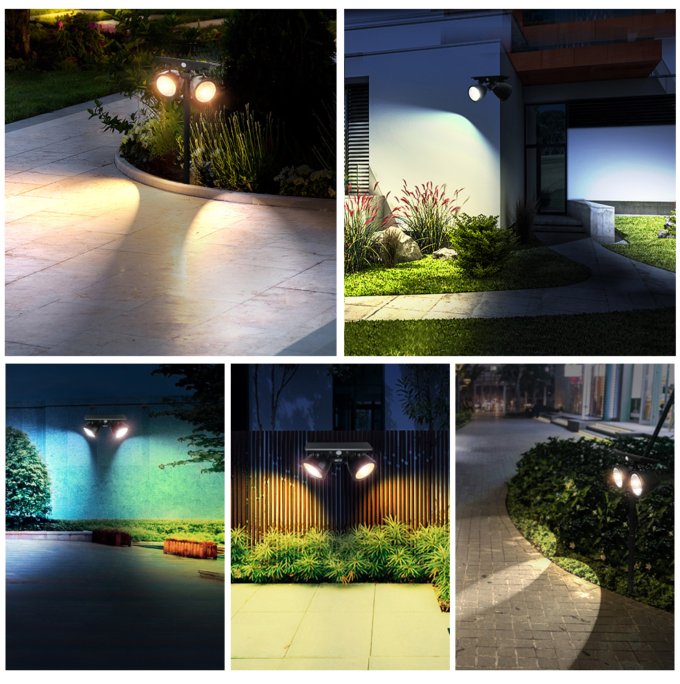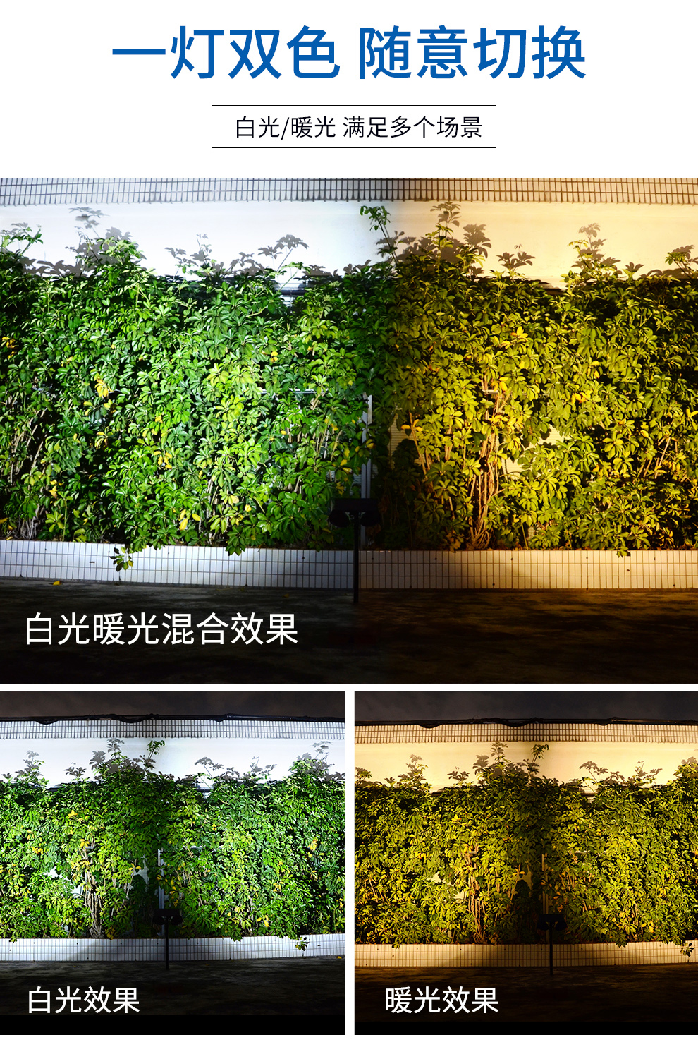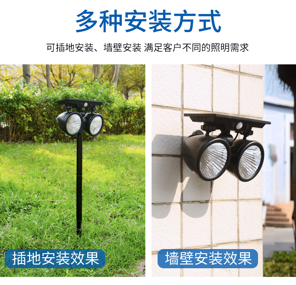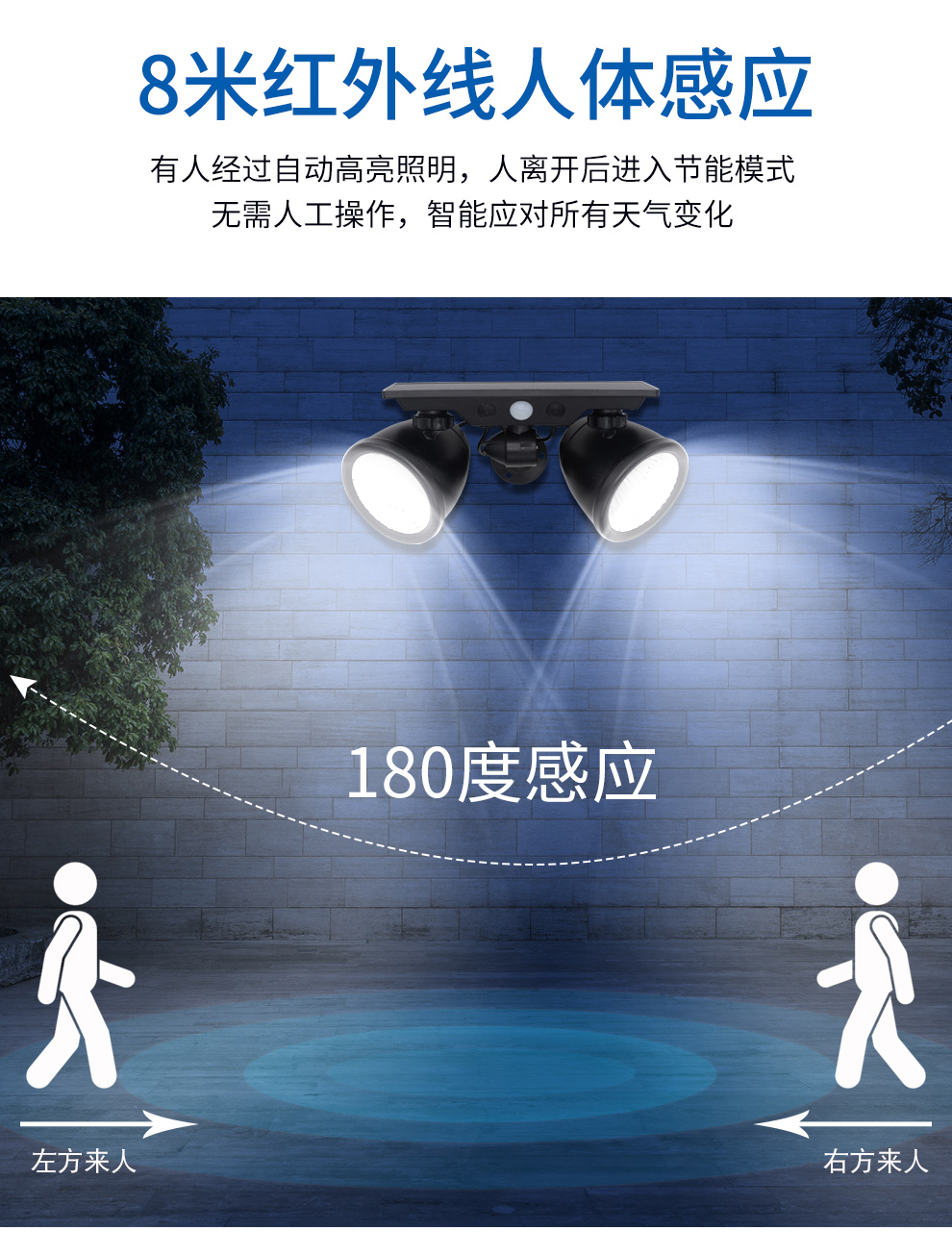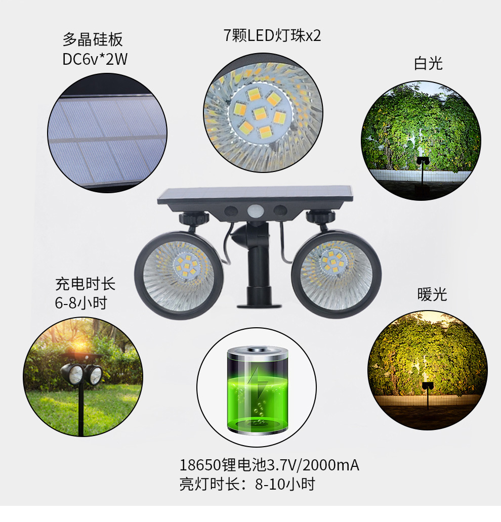 双灯头太阳能草坪灯高效多晶硅太阳能板充电,太阳能板可180°旋转,灯头可360°旋转太阳能板: DC6V*2W高效多晶压层太阳能板LED参数 : 14颗高亮暖/白双色LED,光照面积40-100平米角度方向可调工作时长: 1档感应强光>100次/弱光长亮12小时, 2档感应>150次 3档8小时, 4档>200次充电方式: 太阳能充电充电时长: 6-8小时(不同季
