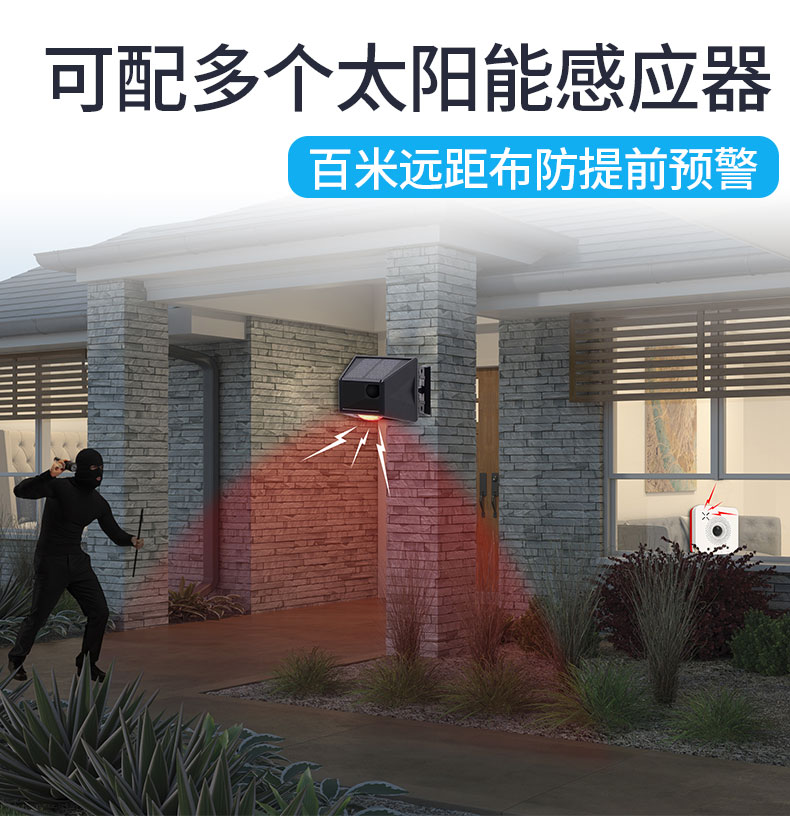 3.可一配多个户外太阳能感应器,百米远距布防提前预警。