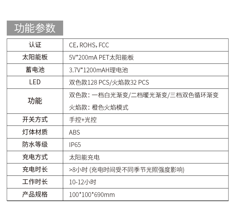 充电时长:>8小时 (充电时间受不同季节光照强度影响)