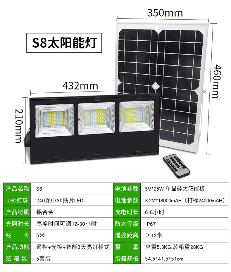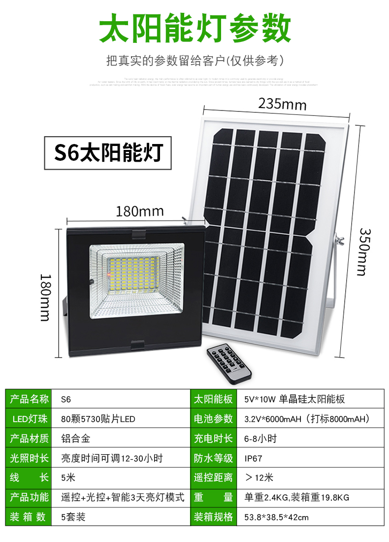 太阳能板:5V*15W单晶硅太阳能板LED:160颗5730贴片LED,光照范围>100m²电池:3.2V*16000mA材质:铝合金充电方式:太阳能充电充电时长:6-8小时光照时长:亮灯时间可调12-30小时线长:5米 0.5平方全铜芯 环保耐寒皮套防水等级:IP66功能:遥控+光控+8档定时+3档调节亮度+记忆功能+智能3天亮灯模式