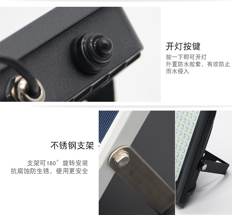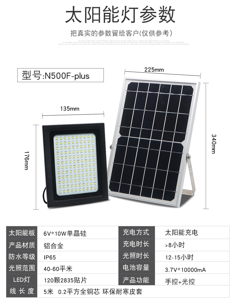 太阳能板:6V*10W单晶硅钢化玻璃压层板,配不锈钢支架LED:120颗2835贴片LED(600-800流明)金线铜支架开关方式;手控+光控光照范围:40-60平方米充电方式:太阳能充电充电时长:>8小时(不同季节的光照强度会影响充电效率)光照时长:12-15小时线长:5米防水延长线,0.2平方全铜芯,环保耐寒皮套防水等级:IP65包装:太阳能板/灯体单独牛卡盒包装电池:3.7V*10000mA足容量单套重量:2.2KG