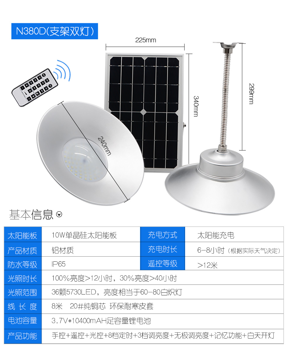 380E:6V*10W单晶硅太阳能板,80颗5730LED,光照时长8-30小时,配备3.2V*9000mAH磷酸铁锂电池