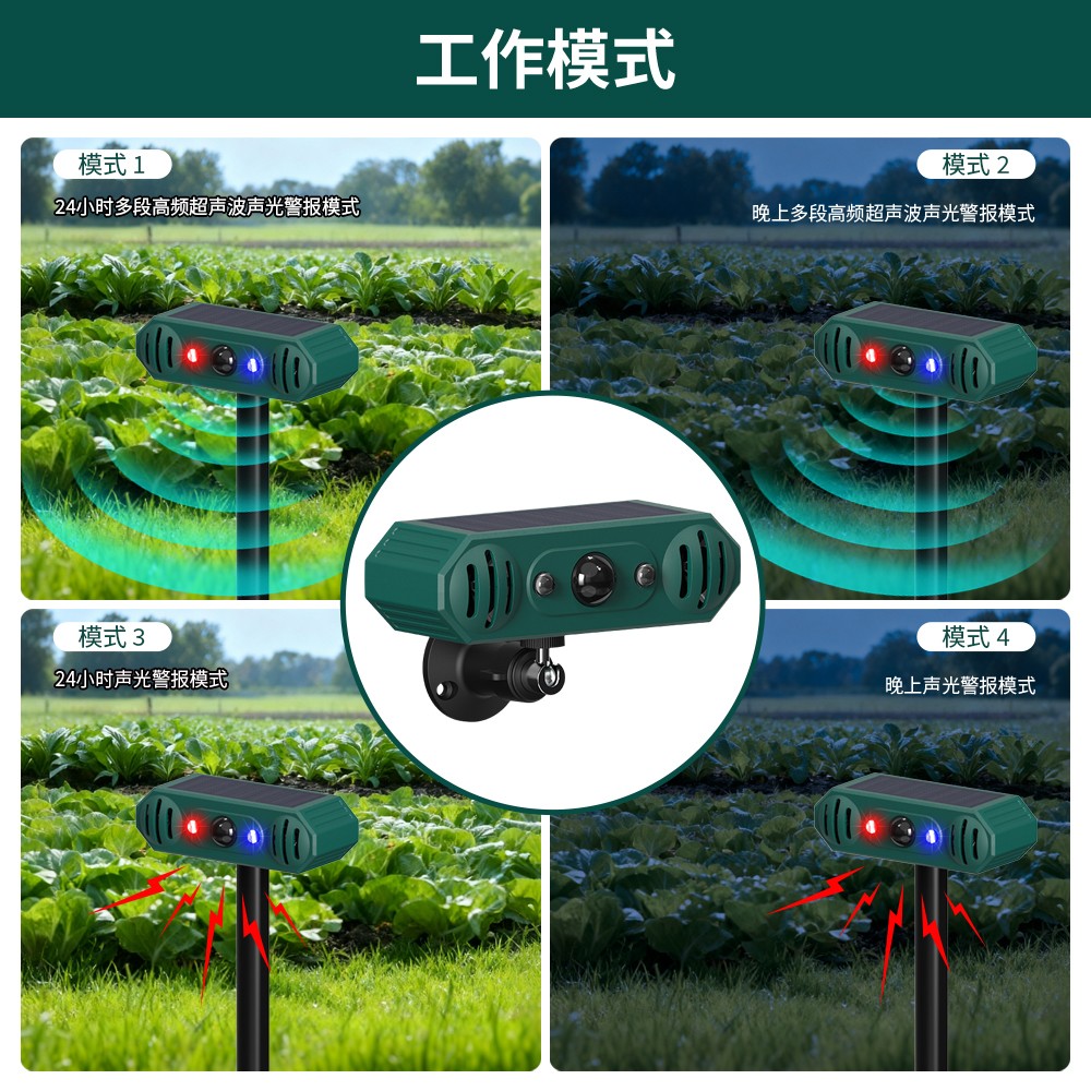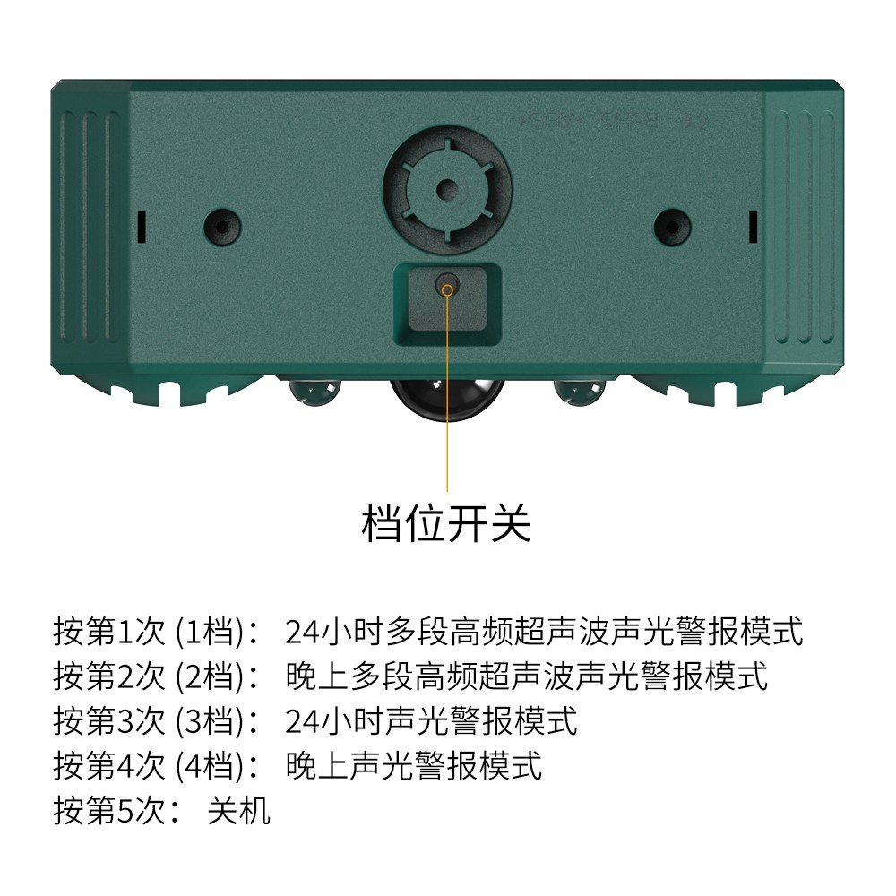 功能:1档24小时多段高频超声波声光警报模式; 2档晚上多段高频