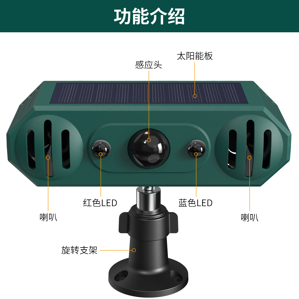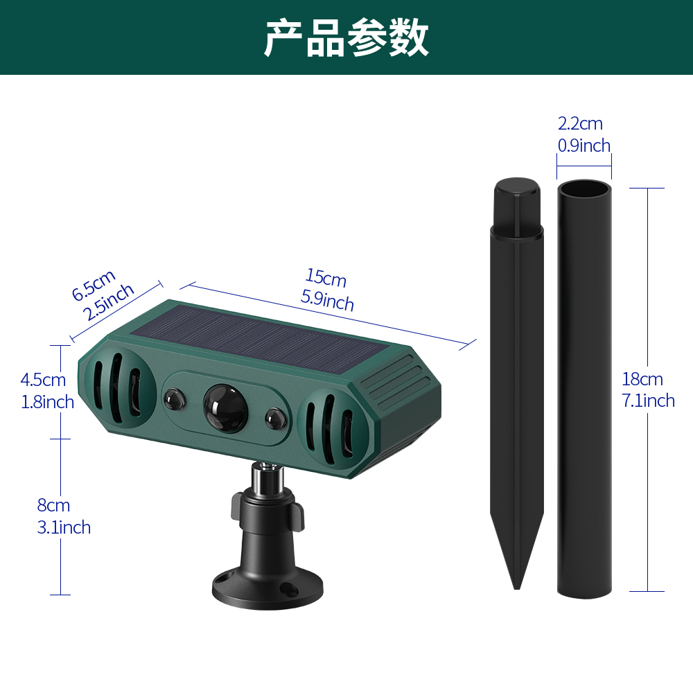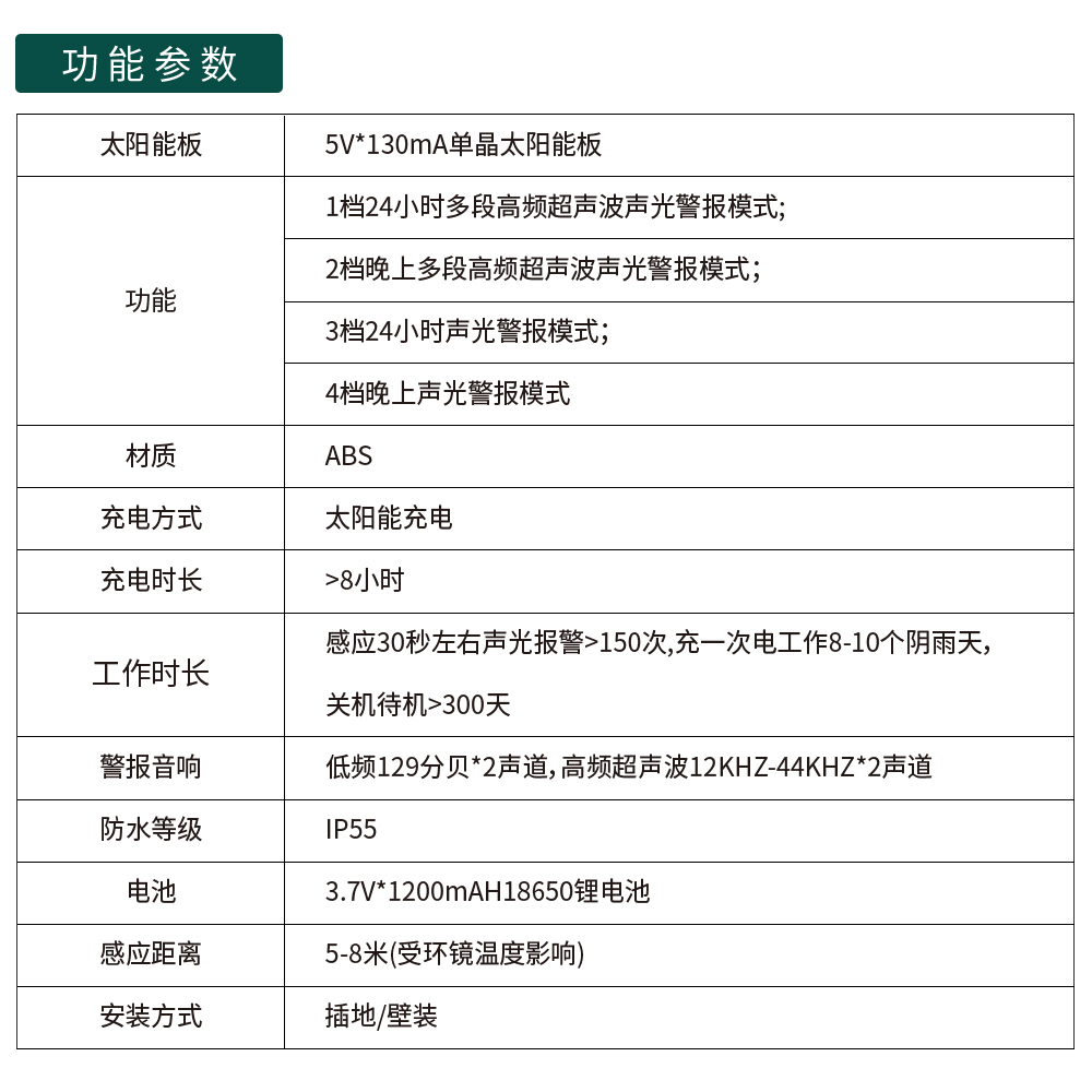 工作时长:感应30秒左右声光报警>150次,充一次电工作8-10个阴雨