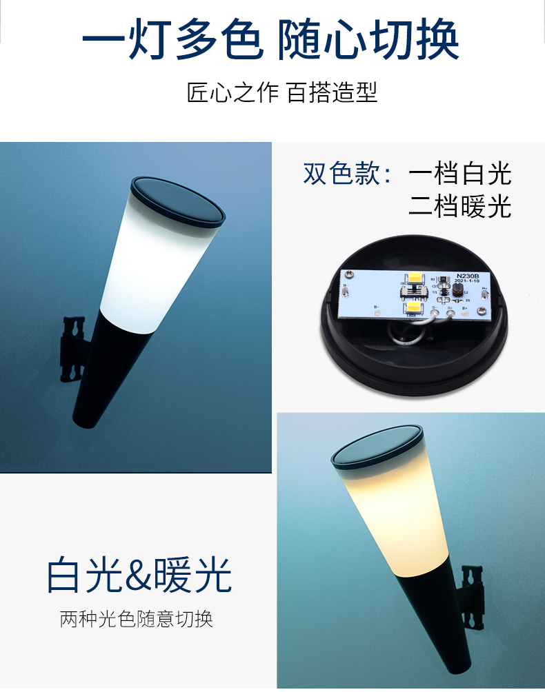 开关方式:光控+自动变色+定色 双色款光控+选色
